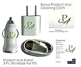Original Product Ace(TM) Brand 3pc IPHONE 5/5S/5C Data Cable, USB Car & Home Travel Charger set 1mAh CE ROSH Certified Power! Now in White UPDATED iOS 7.1 Packaged in Product Ace Brand Gift Box & Packed with Product Ace Microfiber Cleaning Cloth
